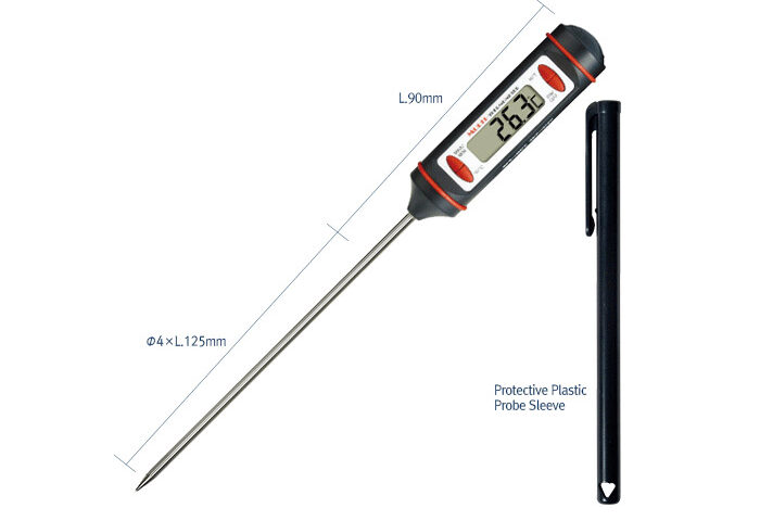 Termómetro digital de bolsillo, viene funda protectora de plástico con clip para mejor sujeción en bolsillo. Sonda de acero inoxidable de 4 mm de diámetro, idónea para medición de temperatura en sólidos. Visualización de temperatura instantánea y de precisión. 1 segundo de tiempo para la detección de temperatura normal. Gran pantalla LCD con dígitos de 10 mm de altura. Aprobación CE. Diseño en forma de bolígrafo/lapicero.